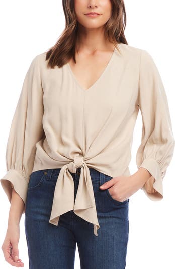 A jaunty tie at the front hem defines this breathable, lightweight top that's framed by billowy three-quarter sleeves.