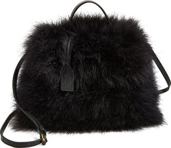 A trussed-up silhouette artfully wrapped with a removable belt cinches this innovative handbag made from satin covered with turkey feathers designed to mimic the look and texture of faux fur.