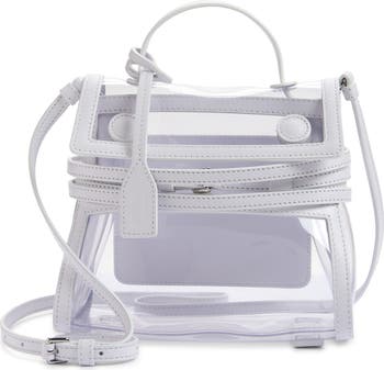 A trussed-up silhouette, artfully wrapped with a removable leather belt, cinches this capacious Italian-made handbag crafted from transparent PVC that playfully serves as a window into what you're carrying.