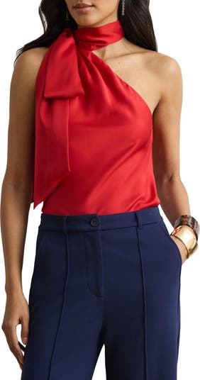 A halter-style asymmetric neckline is popped with a frothy bow on this glossy charmeuse top that elevates any look you pair it with.