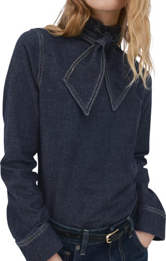 You favorite denim button-up takes a pretty turn with a tie that flutters from the crisp stand collar.