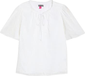 Gathers release from the neckline to soften the fit of this airy overlay top that's sweetly framed with puffed sleeves.