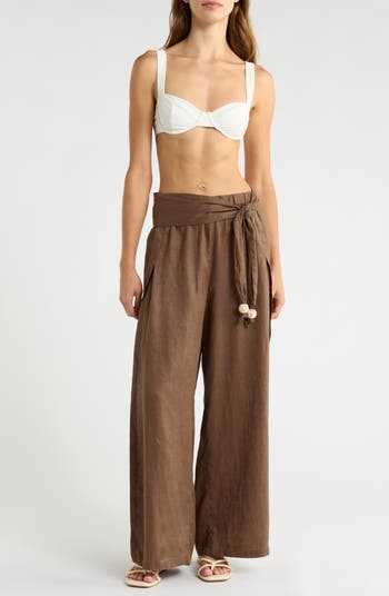 Beaded ties and breezy linen give boho appeal to these wide-leg cover-up pants that look at home by the water with breezy slits.