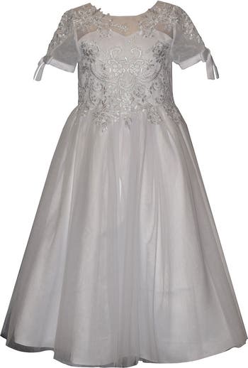 This short sleeve satin and tulle communion or flower girl dress features an elegant lace medallion bodice and sleeves. The illusion and sweetheart neckline and flared layered tulle skirt adds extra elegance to the look.