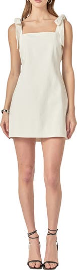 Charm your way through the sunshine season in this nonstretch-denim mini styled with bow-topped shoulders and square necklines.