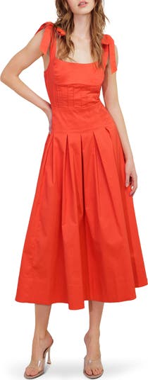 A corset-inspired bodice and elasticized back straps bring stunning dimension to a crisp cotton midi dress topped with adjustable tie straps and balanced by a pleated skirt.