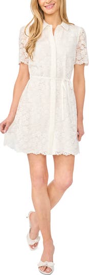 A dainty tie tethers the waist of this leggy-length shirtdress romanced by lovely lace and framed by abbreviated sleeves.