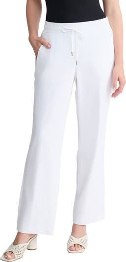 A drawstring waist gives ease and comfort to these crisp linen-blend pants punctuated with tapered legs.