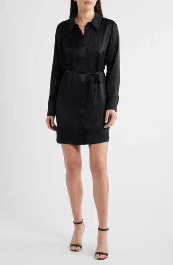 A slender tie belt defines the waist of this polished leggy-length shirtdress cut from rich satin.