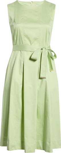 A charming tie belt defines the waist of this sleeveless maxi cut from crisp stretch poplin and accented with inverted pleats to enhance its flared silhouette.
