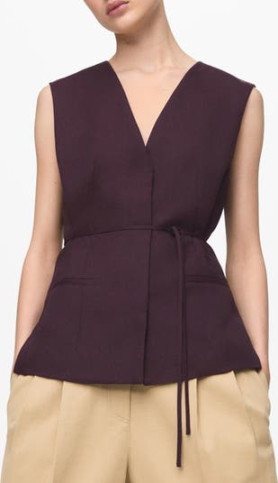 This tailored vest is designed with a professional sensibility. Vertical seams create a sharp streamlined fit, while a hidden placket keeps the look sleek and refined. Finished with a narrow tie at the waist for subtle definition, it's a polished layering piece for modern workwear.