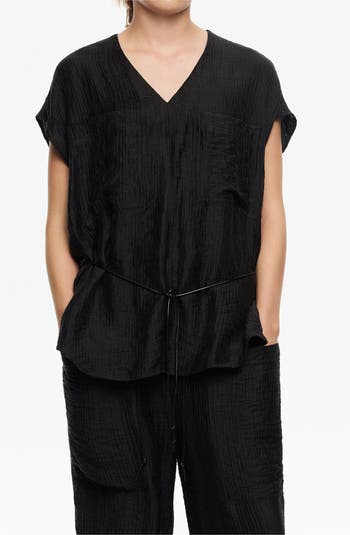 Long top with plastic-coated cord with knots at the waist and plunging V-neckline