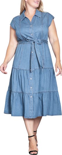 A cap-sleeve shirtdress (with pockets!) made from lightweight denim features vertical seaming through the bodice and a tiered skirt to give it that just-so flare.