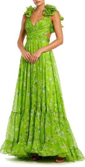 Chiffon gown with cut-out sides, pleated bodice, lace-up back, ruffled shoulders, and tiered skirt—perfect for a bold, romantic statement.