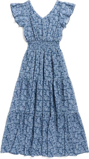 Billowy tiers give movement to a fanciful midi dress with fluttery sleeves.