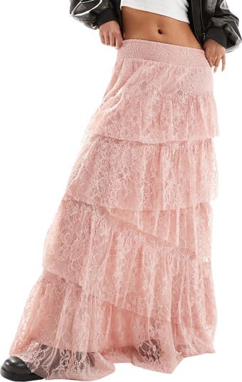 Tiers of fluttery floral lace add romance to this vintage-inspired maxi skirt topped with a comfortable smocked waist.