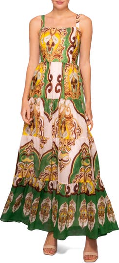 A colorful print brings eye-catching style to a billowy tiered maxi dress that's smocked at the back for a perfect fit.