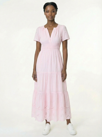 Softly romantic and breezy, this tiered pink maxi dress is crafted from lightweight cotton for all-day comfort and effortless movement. The multi-tiered skirt adds flirty volume and gentle texture, while the maxi length creates an ethereal, feminine silhouette perfect for warm-weather occasions.