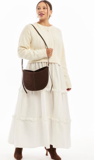 A knit sweater top meets a tiered woven skirt in this mixed-media maxi dress. Its ribbed trim and gathered tiers create a polished twofer look with modern romance. Women's plus-size maxi dress. STYLE NOTES Slightly fitted silhouette Crew neck Ribbed cuffs Ruffled tiered skirt 57" length FABRIC & CARE 55% Cotton, 45% Acrylic Machine wash gentle