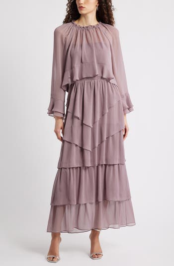 Turn heads wherever the evening takes you in a gorgeously rendered maxi dress cut from airy chiffon with cascading tiered ruffles for dazzling dimension. The style includes a matching cape you can wear on chilly nights or leave off to showcase your shoulders in the smocked, spaghetti-strap bodice.