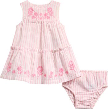 This tiered dress made of soft cotton with floral embroidery, ruffles and stripes is a perfect warm-weather outfit for baby.