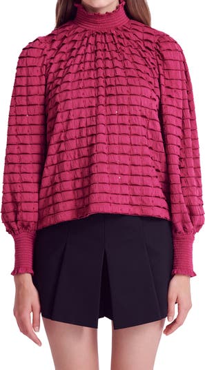 Ripples of layered ruffles charm this jersey top designed with a high neckline and smocked cuffs.
