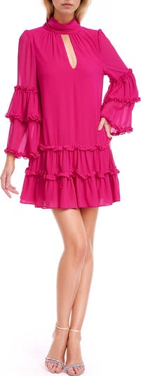 Tiered Ruffle Long Sleeve Keyhole Cutout Trapeze Dress