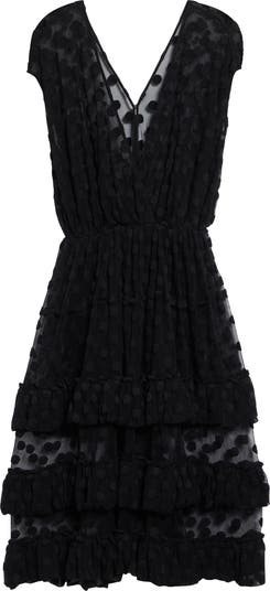 Crafted from delicate cotton-and-nylon mesh patterned in plush polka dots, this mostly transparent dress features a gathered bodice with plunging neckline and a skirt of soft tiered ruffles for a contrast of opaque and sheer.