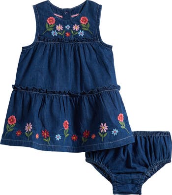 A tiered dress with ruffle trim brings playful volume to this cotton denim dress detailed with contrast topstitching and paired with matching bloomers that keeps your baby looking sweetly coordinated.