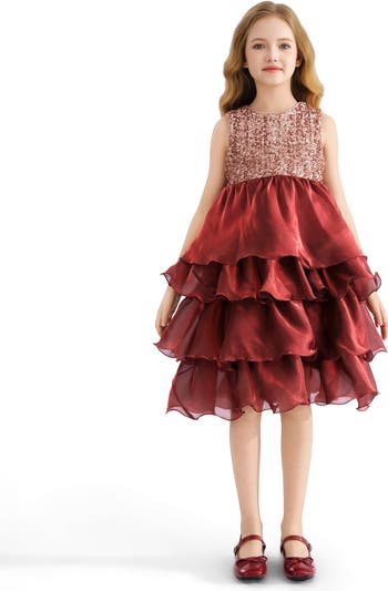 A celebration-ready favorite, this dress pairs a textured bodice with a lustrous, layered skirt. Its rich tones and playful volume make it perfect for birthdays, weddings, or holiday gatherings.