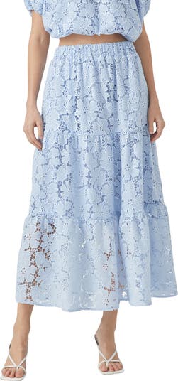 Flowy tiers sway with every step you take in this dreamy maxi skirt made from airy lace detailed with shimmery sequins.