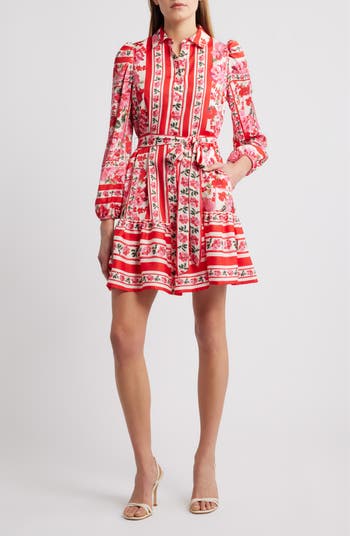 Flowery stripes romance this tie-waist shirtdress framed by delightful puff shoulders and a flouncy tiered skirt.