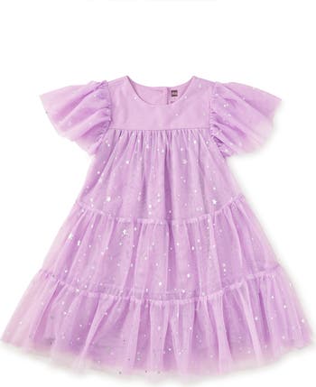 Dreamy layers of star-scattered tulle make this dress a true showstopper. Designed with a tiered trapeze silhouette and fluttery sleeves, it's floaty, twirly, and full of magic. The soft cotton body keeps it comfy, while the sheer sparkle overlay brings all the shine for birthdays, holidays, and any celebration that calls for a little extra shimmer.
