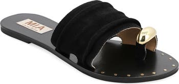 A hardware-accented toe loop and ruched suede upper define a weekend-ready slide sandal set on a leather-covered footbed adorned with glossy microstuds.