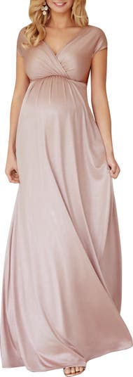 Made of soft jersey that shines as you sway across the room, a maxi dress has a bump-friendly gathered waist and surplice neck that makes nursing a breeze. For added versatility, the neckline can be worn on or off the shoulders for vintage glamour.