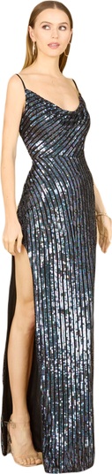 From our new brand, Friday the 18th comes this cowl neck sequin dress with a high slit.