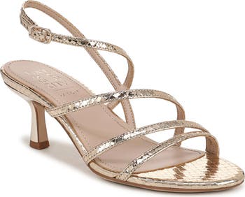 Asymmetric straps and a sculpted heel bring architectural lines to a slingback leather sandal featuring a cushioned footbed with enhanced flexibility and shock absorption.