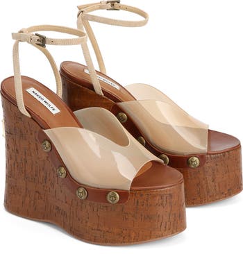 Tiger-Lilly, our brand new wedged clog heel with a peep toe design is the perfect addition to any summer look. This upper is made of top grade luxury Italian leather and perspex. The platform is wrapped in a shiny cork wrap featuring the famous wolfe head plaque on the heel.