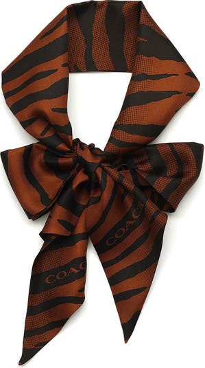 Add a playful touch to your look with this scarf patterned in fierce tiger stripes and fashioned from fluid silk twill. Tie it around the neck or wrist, in your hair or attach it to the handle of a favorite handbag.