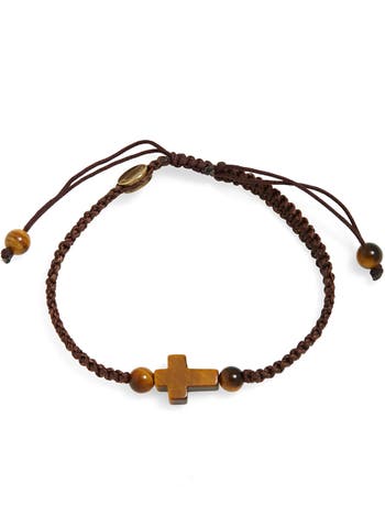 A smooth tiger's-eye cross adds refined style to this macramé bracelet styled with an adjustable closure.