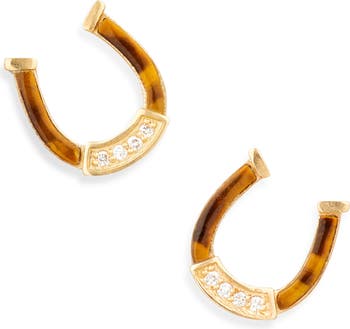 Tiger's eye inlays bring organic color to these 18-karat gold horseshoe stud earrings illuminated by a diamond quartet.