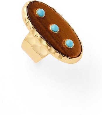 Turquoise bezels add a pop of contrast to this tiger's eye ring set on an adjustable band plated in 24-karat gold.