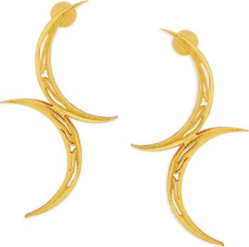 The Tila Earrings are handcrafted drop earrings made from 22k gold-plated brass. Their geometric forms feature layered and lightly textured surfaces for visual interest. Lightweight and easy to wear, these earrings sit securely on the ear.