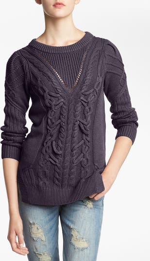 Tangled cables climb the front of a mixed-stitch sweater with an open-stitch V at the neckline.
