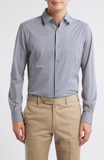 Tailored from a breathable cotton-blend knit, this dress shirt patterned in neat medallions resists wrinkles and retains its shape to smarten any semiformal look.