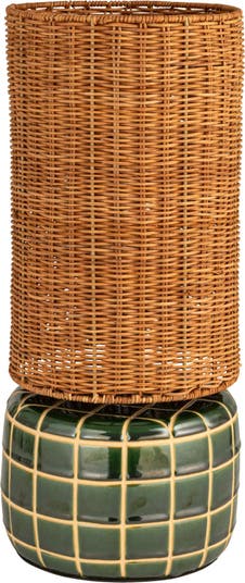 - A stunning table lamp set featuring a ceramic tiled base in green and a hand-woven rattan shade in natural tones
