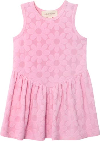 This pink daisy terry cloth sun dress, featuring a v-waist and sleeveless design, is ideal for everyday adventures. It also doubles as a stylish cover-up for family beach outings. Fabric Care & Content Machine Wash Cold | Line Dry | Do Not Bleach 96% Polyester 4% Spandex
