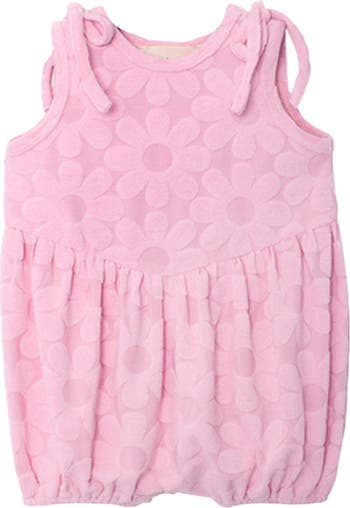 This pink daisy terry cloth romper, featuring a v-lined empire waist and sleeveless design, is ideal for everyday adventures. It also doubles as a stylish cover-up for family beach outings.Fabric Care & Content Machine Wash Cold | Line Dry | Do Not Bleach 96% Polyester 4% Spandex