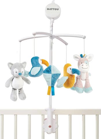 This softly moving crib mobile featuring the brand's Tim and Tiloo characters has a pull-cord operated music box that plays the gentle lullaby "La-Le-Lu".