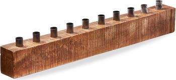 • Timber Taper Centerpiece is made from natural mango wood and iron measuring 28.5 inches long, 2.75 inches wide, and 3.4 inches high.